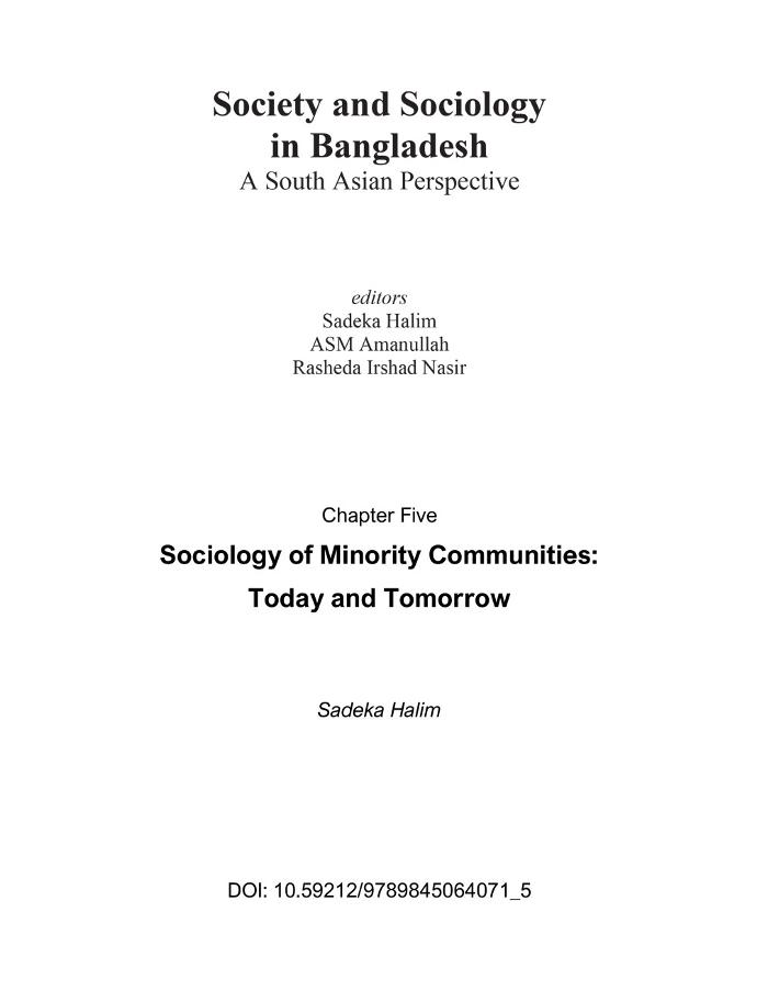 Halim, Sadeka, AU. Sociology of Minority Communities: Today and Tomorrow. Society and Sociology in Bangladesh:  A South Asian Perspective. Dhaka, Bangladesh. https://dx.doi.org/10.59212/9789845064071_5