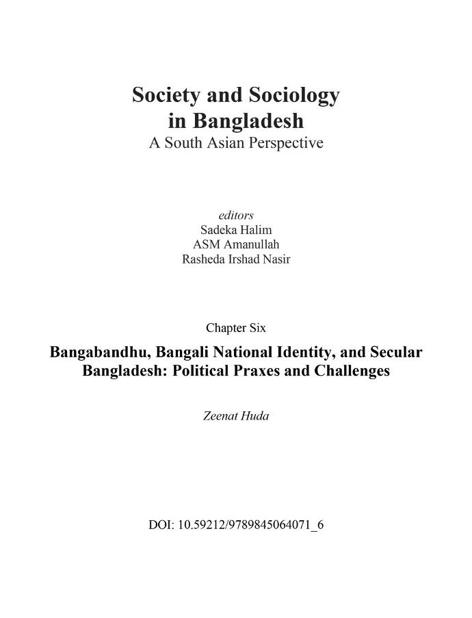 Huda, Zeenat, AU. Bangabandhu, Bangali National Identity, and Secular Bangladesh: Political Praxes and Challenges. Society and Sociology in Bangladesh:  A South Asian Perspective. Dhaka, Bangladesh. https://dx.doi.org/10.59212/9789845064071_6