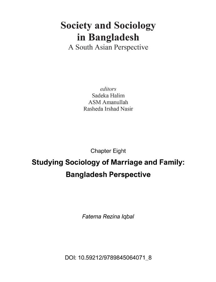 Iqbal, Fatema Rezina, AU. Studying Sociology of Marriage and Family: Bangladesh Perspective. Society and Sociology in Bangladesh:  A South Asian Perspective. Dhaka, Bangladesh. https://dx.doi.org/10.59212/9789845064071_8